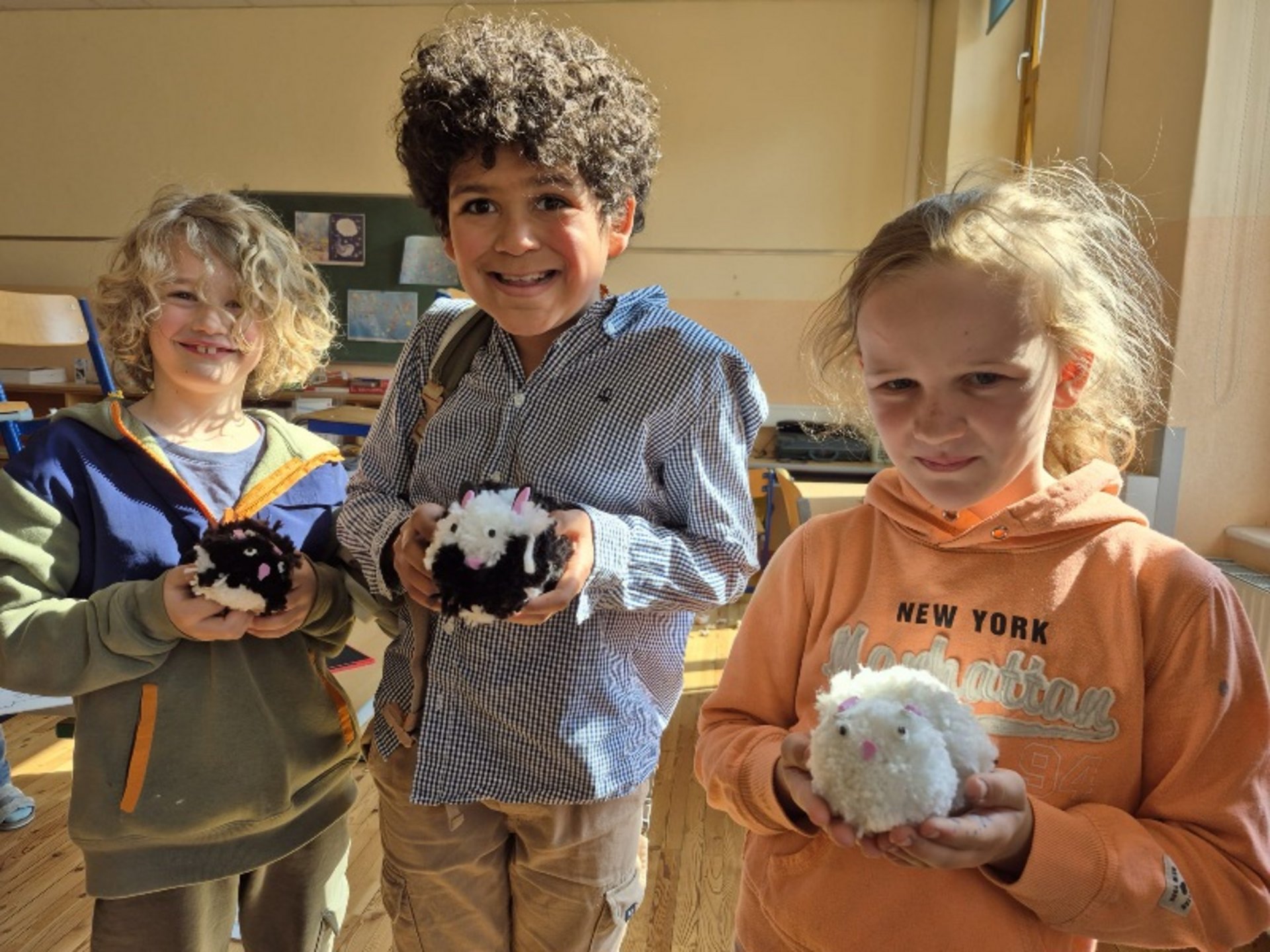 Auch die Schülerinnen und Schüler der 1. und 2. Schulstufe sind mit großer Freude dabei: Sie fertigen niedliche Wollhasen an, die mit viel Geschick und Stolz gestaltet werden.